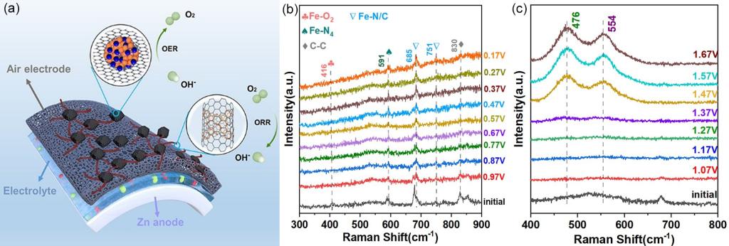 (3)以碳纳米管为桥梁,其管壁上的掺杂氮原子桥接酞菁铁分子(形成氧还原反应Fe-N5活性位点),桥接的碳颗粒担载NiCo纳米颗粒(原位拉曼揭示纳米颗粒会原位转化为氢氧化物,即氧析出反应的真正活性物质)。该催化剂表现出超高的氧电极活性(ΔE=0.686 V),锌空电池输出性能(功率为219.5 mW cm-2)和循环稳定性能(700多次循环充放电性能无衰减)。相关成果以“Carbon-nanotube-bridging strategy for integrating single Fe atoms and NiCo nanoparticles in a bifunctional oxygen electrocatalyst toward high-efficiency and long-life rechargeable zinc–air batteries”为题发表在Advanced Energy Materials(IF=29.698)上,独播库