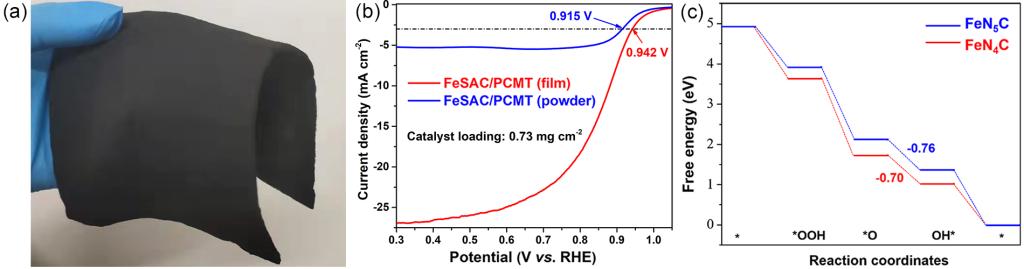 (2)采用有机金属框架嫁接-衍生技术,在三维柔性多孔碳微米管海绵基底上制备富含Fe-N5单原子位点的催化剂薄层,提高了Fe-N5原子位点的利用率。实验和理论结果揭示了Fe-N5位点具有比Fe-N4位点更高氧还原反应活性。此外,通过半电池和全电池测试,证实了制备的单原子催化剂一体化电极的结构优势。相关成果以“Bulk preparation of free-standing single-iron-atom catalysts directly as the air electrodes for high-performance zinc-air batteries”为题发表在Carbon Energy(IF=21.556)上,独播库