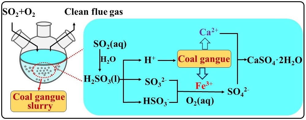 全球煤炭产量约80亿吨/年,中国约占50%,是世界上最大的煤炭资源消费国。然而,煤炭的燃烧过程会释放出大量的SO2,导致酸雨、雾霾等环境问题。为此,研究者们开发了上百种脱硫技术,但工业化运用的仅有几十种。目前,烟气脱硫技术主要存在经济运行成本较高、固液二次污染等问题,亟待开发绿色、低成本的脱硫技术。近年来,利用工业固体原料/废弃物为吸收剂脱除燃煤烟气中的SO2污染物已受到学者广泛关注。煤矸石是煤炭开采和洗选过程中产生的固体废物,中国的煤矸石储量和年增长量分别达到4.5-5亿吨和0.37-0.55亿吨,是世界上煤矸石储量最大的国家。鉴于此,本团队发明了一种利用煤矸石作为脱硫剂脱硫的新方法,可以实现固体废物资源化利用和SO2污染物治理的双重目标。在这篇论文中,研究了工艺操作条件对SO2吸收率的影响,优化了脱硫工艺操作参数,实验表明煤矸石浆具有较好的脱硫性能,脱硫容量可达33.12 g SO2/L煤矸石浆。此外,根据对脱硫过程中气、液、固三相物质组成的分析,确定了脱硫活性物质和产物。煤矸石中溶解的Fe3+对SO2的有效吸收有显著影响。SO2在水中溶解形成的HSO3-在微量Fe3+的催化作用下可迅速转化为SO3•−自由基,从而诱导SO5•−、SO4•−、HO2•、HO•等活性氧化物质,促进SO2向SO42-的转化,实现高效脱硫,这项研究对煤矸石浆脱硫技术的工业化应用具有重要的指导意义。
