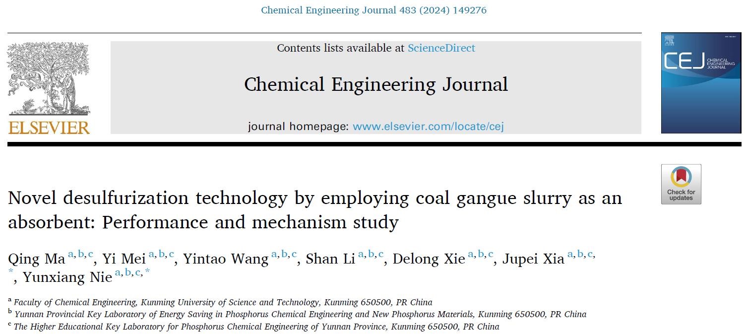 、云南省磷化工节能与新材料重点实验室在化学工程领域知名期刊Chemical Engineering Journal上发表了题为“Novel desulfurization technology by employing coal gangue slurry as an absorbent: Performance and mechanism study”的研究论文,独播库