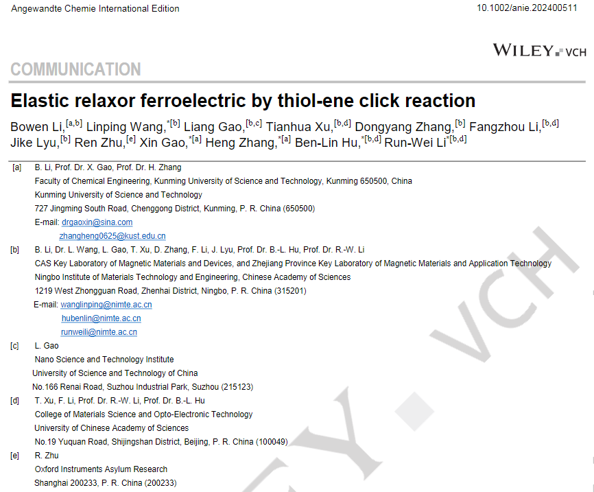 张恒正高级实验师课题组和中国科学院宁波材料技术与工程研究所柔性磁电功能材料与器件团队合作,在铁电材料弹性化领域取得重要研究进展,相关成果以“Elastic relaxor ferroelectric by thiol-ene click reaction”为题发表在国际化学顶级期刊《Angewandte Chemie International Edition》上。独播库