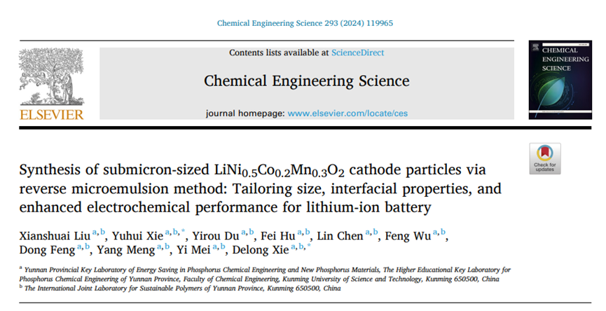 、云南省磷化工节能与新材料重点实验室在锂离子电池三元正极材料(NCM)的亚微米级可控制备领域取得新进展,相关研究成果“Synthesis of submicron-sized LiNi0.5Co0.2Mn0.3O2cathode particles via reverse microemulsion method: Tailoring size, interfacial properties, and enhanced electrochemical performance for lithium-ion battery”发表在化学工程领域知名期刊Chemical Engineering Science上(//doi.org/10.1016/j.ces.2024.119965)。论文第一作者为独播库