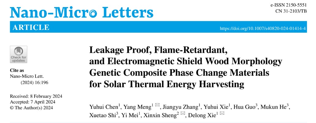 上述研究成果以“Leakage Proof, Flame‑Retardant, and Electromagnetic Shield Wood Morphology Genetic Composite Phase Change Materials for Solar Thermal Energy Harvesting”为题发表在Nano-Micro Letters(IF2022=26.6,即时影响因子31.38)上。论文第一作者为独播库