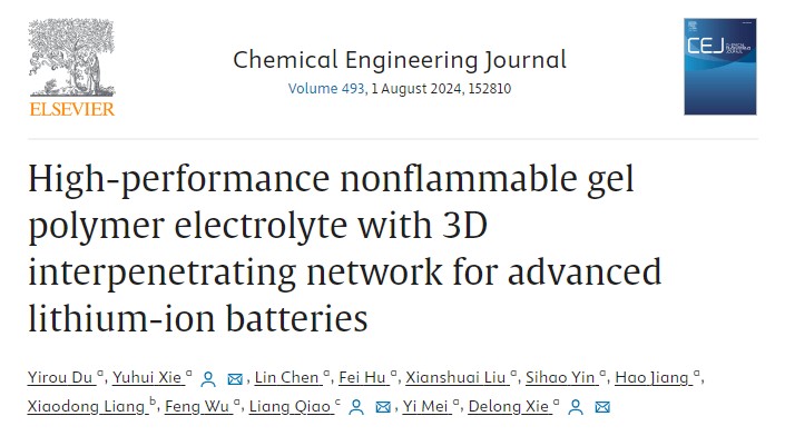 上述研究成果以“High-performance nonflammable gel polymer electrolyte with 3D interpenetrating network for advanced lithium-ion batteries”为题发表在化学工程领域Top学术期刊Chemical Engineering Journal上,论文第一作者为磷化工团队2020级博士杜依柔,通讯作者为独播库