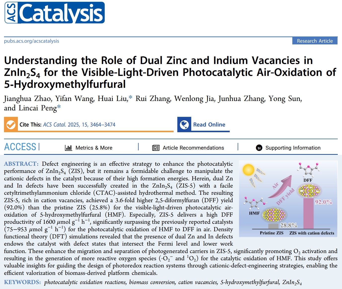 生物质化工团队在光催化氧化提质生物质平台分子方面取得创新突破,相关研究成果以“Understanding the Role of Dual Zinc and Indium Vacancies in ZnIn2S4for the Visible-Light-Driven Photocatalytic Air-Oxidation of 5‑Hydroxymethylfurfural”为题发表在催化领域国际权威TOP学术期刊《ACS Catalysis》上。独播库