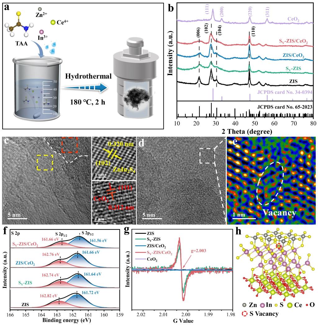 基于此,该研究通过一步水热法构建ZnIn2S4/CeO2异质结并精准调控硫空位浓度,成功实现HMF向DFF的高效光催化转化,在室温空气条件下80 min实现HMF全转化,DFF选择性为96.1%,产率高达952.6 µmol g-1 h-1,优于已有报道的光催化剂。有趣的是,即使在高HMF浓度(100 mM)条件下,其性能仍然显著(HMF转化率83.0%,DFF选择性96.3%)。实验和理论研究表明,硫空位和S型异质结的协同作用促进了光载流子的分离和氧的活化,显著促进了·O- 2的产生,从而促进光催化氧化反应。该研究为从生物质分子中生产高附加值化学品的高效光催化剂的开发提供了见解。