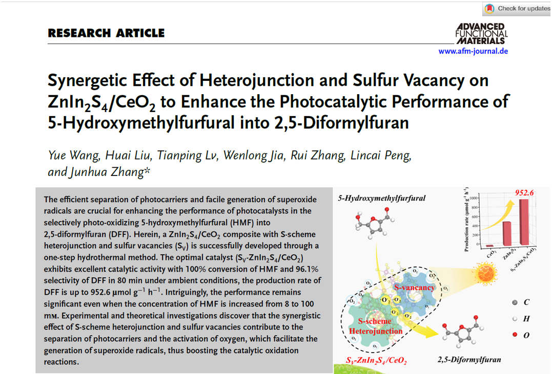 生物质化工团队在新型光催化材料设计并用于生物质平台分子光氧化升级方面取得重要研究进展,相关研究成果以“Synergetic Effect of Heterojunction and Sulfur Vacancy on ZnIn2S4/CeO2 to Enhance the Photocatalytic Performance of 5‐Hydroxymethylfurfural into 2,5‐Diformylfuran”为题发表在材料科学领域国际权威TOP学术期刊《Advanced Functional Materials》(IF=18.5)上。独播库
