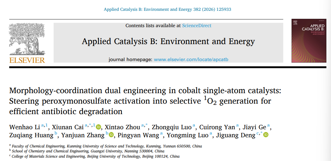 矿业固废高值资源化利用团队在钴单原子催化剂制备及活化PMS高效降解处理抗生素污染水体方面取得重要研究进展。研究成果以“Morphology-coordination dual engineering in cobalt single-atom catalysts: Steering peroxymonosulfate activation into selective 1O2 generation for efficient antibiotic degradation”为题,发表于环境与能源领域国际权威TOP期刊《Applied Catalysis B: Environment and Energy》(影响因子IF=21.1)。独播库