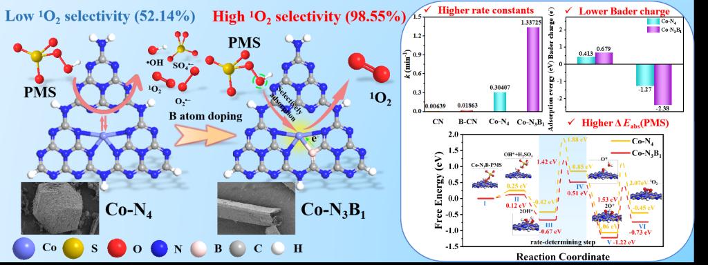 日益加剧的抗生素污染已成为全球水环境治理的重大挑战与研究热点。基于过一硫酸盐(PMS)的高级氧化技术,因能够通过产生活性氧物种(ROS)高效降解有机污染物而备受关注。在多种ROS中,单线态氧(1O2)因其具有适中的氧化还原电位(2.2 V vs. NHE)、较强的亲电性以及对富电子污染物的优异选择性降解性能,被视为理想的降解介质。然而,传统催化剂普遍存在活性位点有限、自由基产生速率缓慢等瓶颈。尽管单原子催化剂(SACs)凭借高的原子利用率展示出潜在优势,但仍面临金属原子易团聚、1O2选择性偏低等难题,严重限制了其在实际水体修复中的推广应用。面对2025年全球抗生素污染物排放量持续攀升的严峻趋势,亟需开发能够高效且高选择性活化PMS的新型催化材料,以应对水环境污染控制的迫切需求。