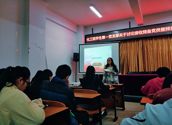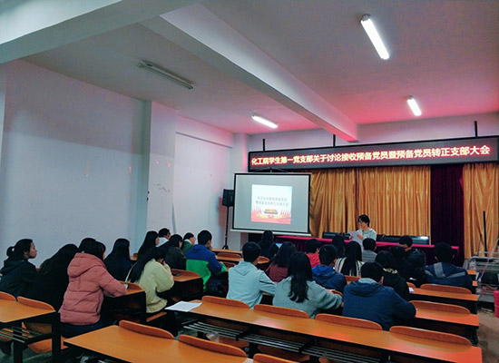 2018年11月23日晚19:00,化工院学生第一党支部关于讨论接受预备党员暨预备党员转正支部大会在化工院负100报告厅顺利召开,参加此次支部大会的有党支部书记杨欢老师,支部全部党员及入党积极分子。