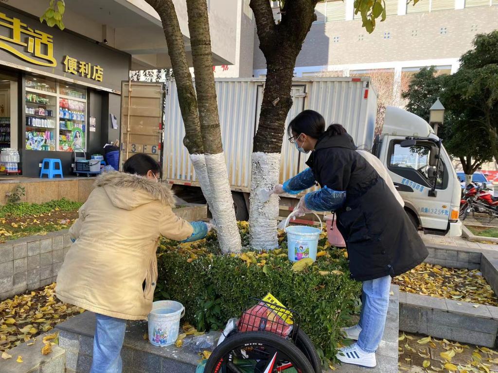 活动中,在绿化工作人员的指导下,党员、积极分子们严格按照树木刷白的流程和标准,依次给怡园学生社区树木进行刷白。在同志们团结互助、齐心协力的努力下,树木齐刷刷穿上“新衣”。