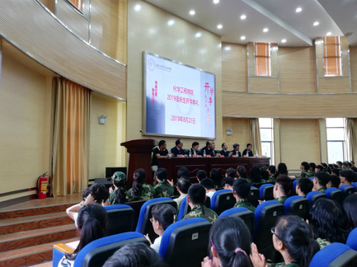 2019级新生开学典礼在化工100报告厅举行。此次典礼有学院党委书记齐毅老师、学院党委副书记李云燕老师、院长梅毅教授、学院副院长李斌教授、副院长贾庆明教授、装控系主任宋鹏云教授、化工系主任夏举佩教授、生物质资源系主任彭林才教授以及学院全体辅导员老师、2019级班主任老师出席,2019级全体新生参加,并由李云燕老师主持。