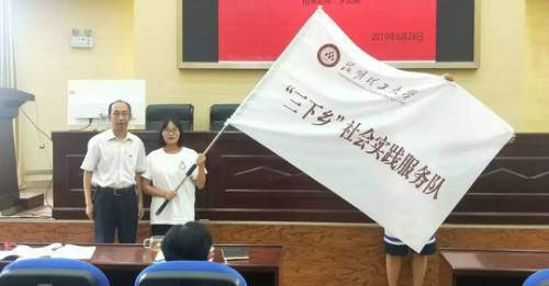 齐毅书记为三下乡社会实践团队授旗并预祝此次社会实践活动顺利完成。