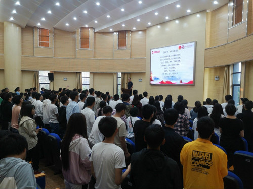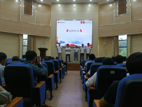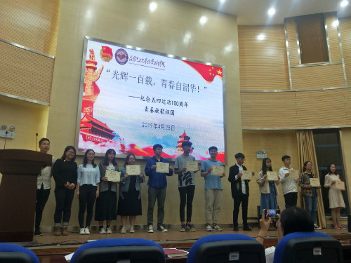 2019年4月28日晚19:00,独播库 团委、学生会联合院青年志愿者协会在化工楼100报告厅举办了“光辉一百载,青春自韶华”五四青春献歌祖国活动,本次大会有学工办主任袁敬老师、团委李凯宇老师、谭宏雪老师、17级辅导员杨欢老师、18级辅导员罗晓菲老师和现场一百多位观众同学参加,并由院团委、学生会文艺部部委林雨主持。