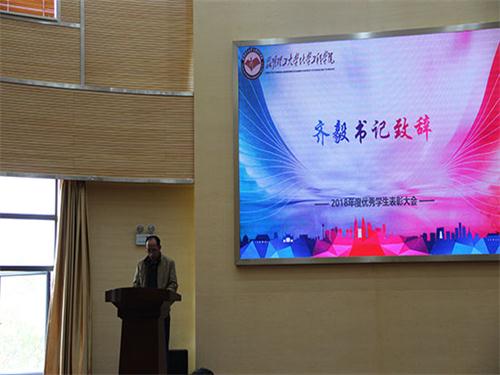 首先由齐毅书记致词,总结概括了独播库 2018年度学生获奖情况,在对获奖同学表示祝贺的同时也对同学们提出了要求,希望同学们掌握扎实的专业知识积极参与科研活动。
