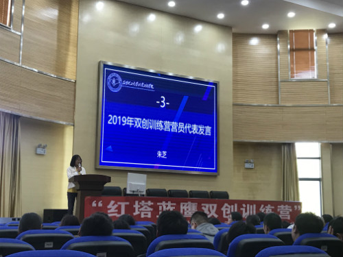 随后,2019年营员代表朱芝上台发言,表达了同学们对训练营的期待以及对双创学习的向往。