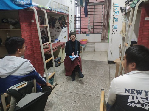 2018年10月10日,班主任郭丽老师走访了班级宿舍,针对宿舍管理、宿舍卫生和宿舍装饰方面提出了一些建设性意见,并指引同学们相互包容、相互理解、互帮互助,同学之间建立友好关系。此次走访让同学们感受到了班主任郭丽老师的亲切与关心,也推动了宿舍优秀文化的发展。