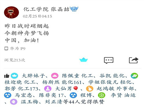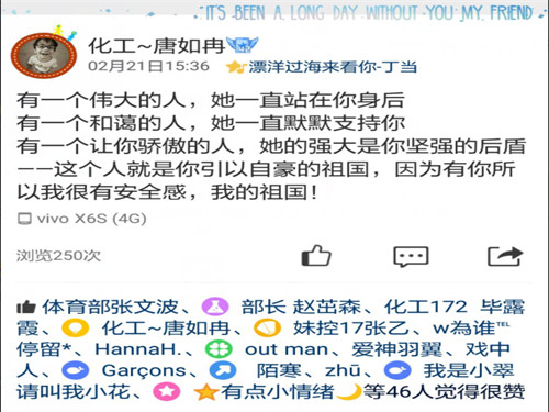 首先,学院团委、学生会在大家新春团圆之际于线上发布通知,号召大家写一份给祖国母亲的三行情诗,通过自己的真情实感,表达对祖国的热爱。随后几天,同学们陆续在网上发表自己的作品,“行万里路,游万个国,还是中国最好”、“国泰民安,五星红旗,我为你自豪”、“看您崛起的雄姿,那是中华振兴的图腾”无一不包含了对祖国深深的爱。