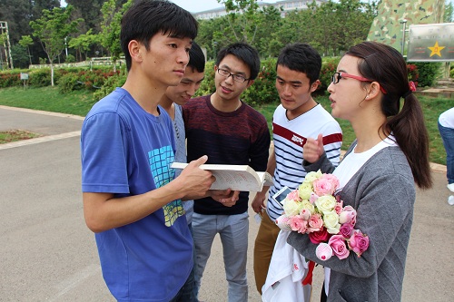 经过4月22日对志愿者进行的初步培训。初升的太阳,点缀得春色更有诗意,次日上午8:30,第一批志愿者小队前往各自的采访区域进行随机采访。在这静谧的校园里,图书馆、公交楼及一些教学楼早已有勤奋求学的读书人了。志愿者向被采访者进行提问,问题包括:今天是什么日子?您平时读什么书?书中对您影响最大的是那一句话等。之后受到采访同学会收到来自勤助会寓意“学海无涯”序号为1-423的读书接力书签及玫瑰花一枝,期望以“赠人玫瑰、手留余香”方式让被采访同学将读书以自己喜爱的方式接力下去。