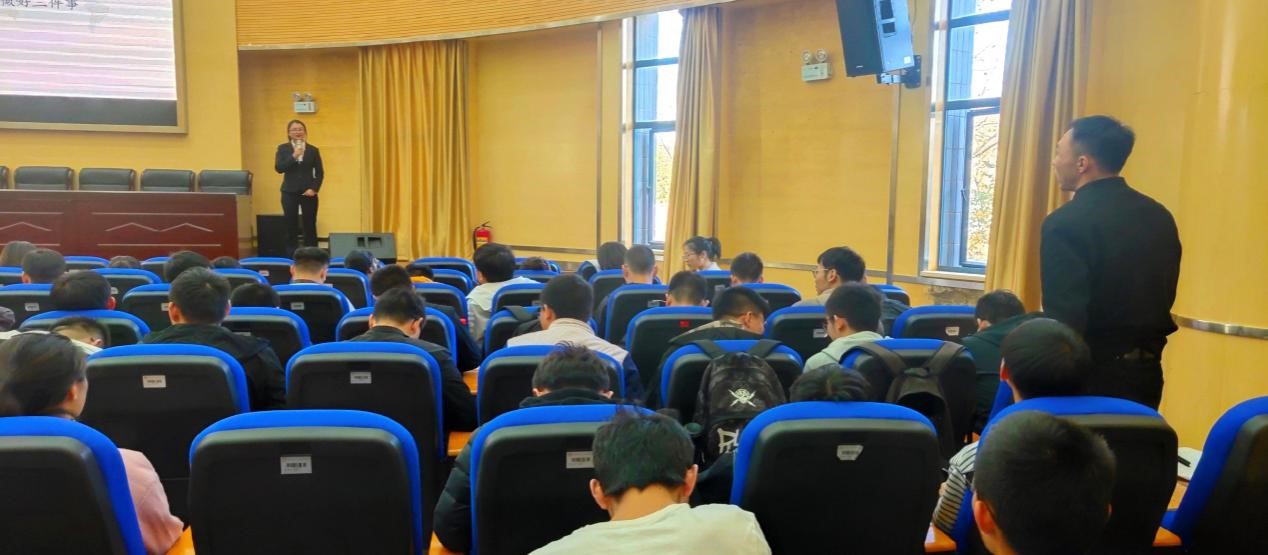 紧接着由保卫处消防科的杨荣芳老师进行消防安全常识的宣讲,首先杨老师总结了各种火灾的发生原因和预防方法,并且与同学们就“火灾时应该怎么办?”进行了互动交流;然后介绍了灭火器的分类,以及手提式灭火器,推车式灭火器等一些常见灭火器使用方法;最后讲解了火场疏散逃生的原则和基本方法。