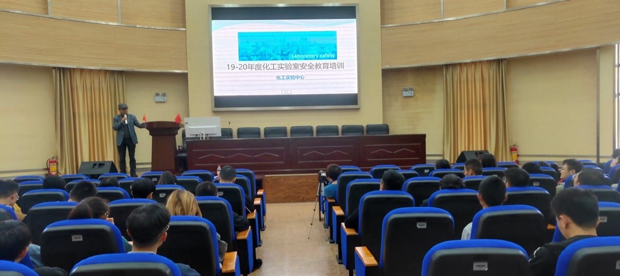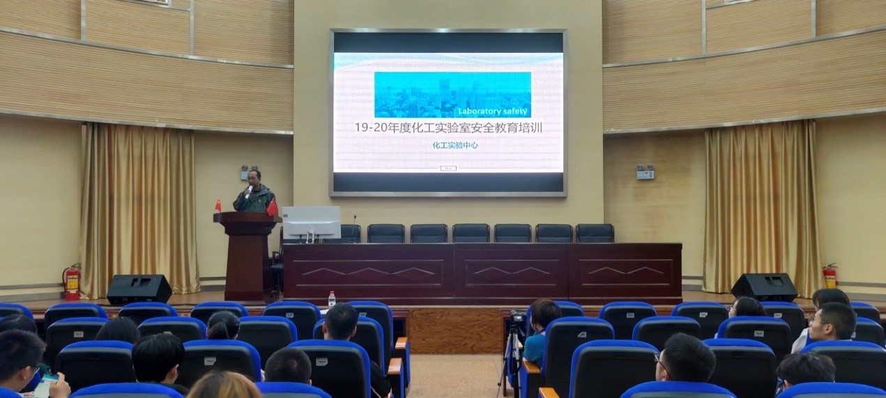 于化工楼100报告厅举办2019~2020年度化工实验室安全教育培训会。本次会议由实验中心刘晓波老师主持,参与人员主要是实验中心的负责老师、所有未参加过消防实训的研究生、本科高年级助研学生。