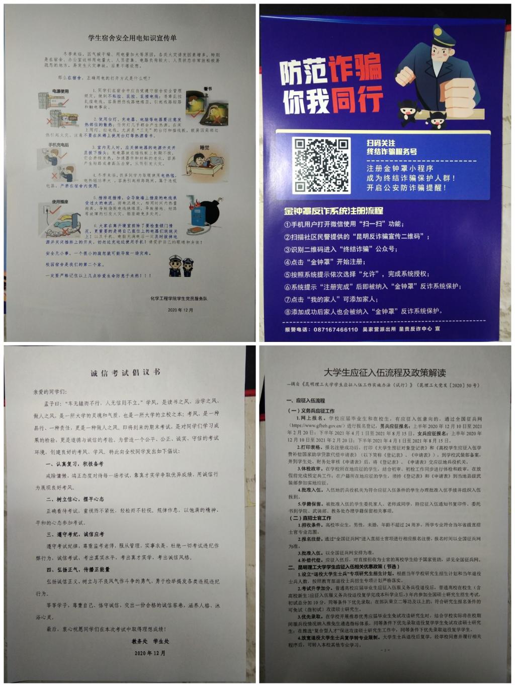 本次活动宣传了大学生应征入伍相关内容,让同学们进一步了解了大学生应征入伍的优惠政策;科普了宿舍安全用电知识,让同学们规范用电,防患于未然;提高了同学们的防范意识,防止上当受骗;强调了诚信考试的重要性,弘扬正气,让同学树立信心,摆平心态,诚信应考。