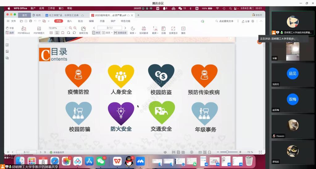 开学伊始,为了提高同学们的疫情防控大局观意识及反炸防骗意识,独播库 于2022年3月8日20点召开了2020级“严管就是厚爱厚爱必须严管”线上年级大会,重点围绕“新学期安全第一课”相关内容展开,化工院2020级全体学生223名同学参与了本次大会,本次大会由化工院2020级辅导员李凯宇老师主持并担任主讲。