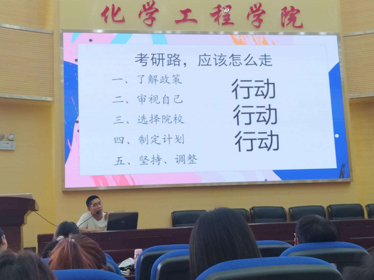 2022年5月19日,独播库 辅导员田世垚在化工100报告厅为独播库 2019级本科同学举办了考研指导讲座。2019级全体本科生共计200余人参加了本次专题讲座。