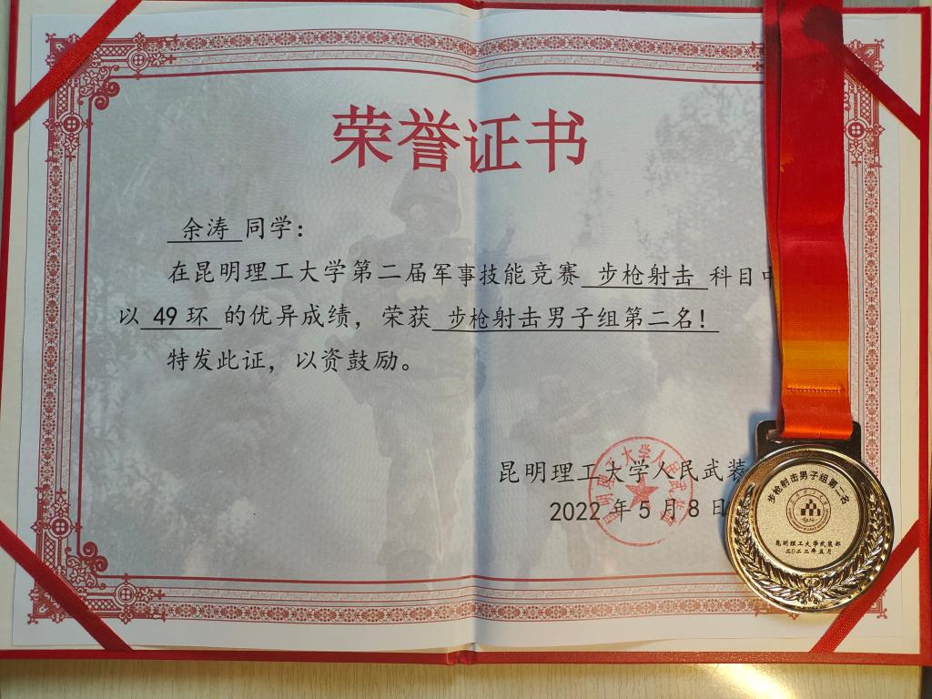 余涛同学在步枪射击科目中以49环的优异成绩,荣获男子步枪射击男子组第二名。