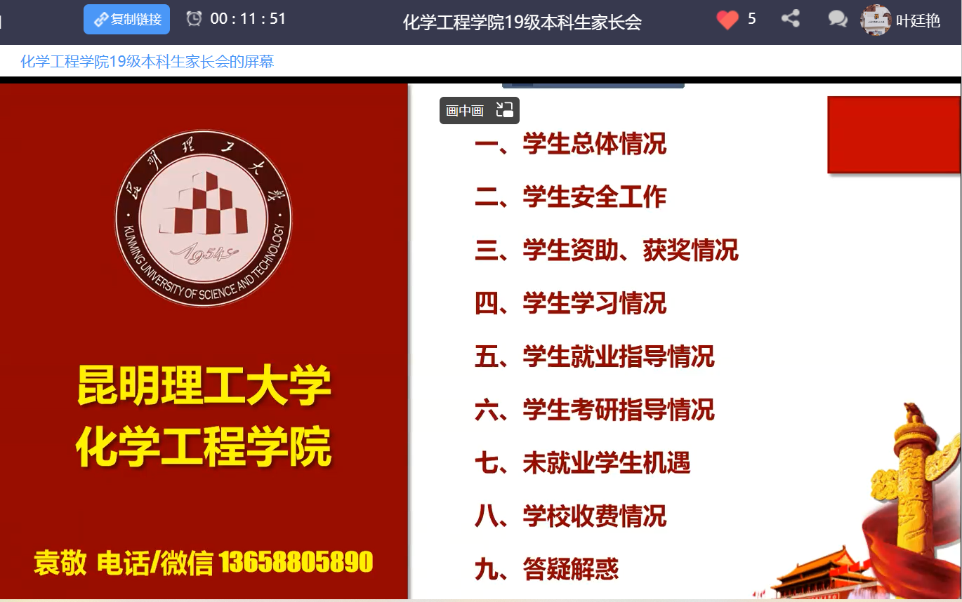 为进一步加强家校沟通,助力化工学子成长,2022年12月16日19:00,独播库 通过网络平台召开了2019级本科学生家长会,本次家长会主讲人为学院学工办主任、2019级辅导员袁敬老师,2019级全体本科生家长参加此次会议。