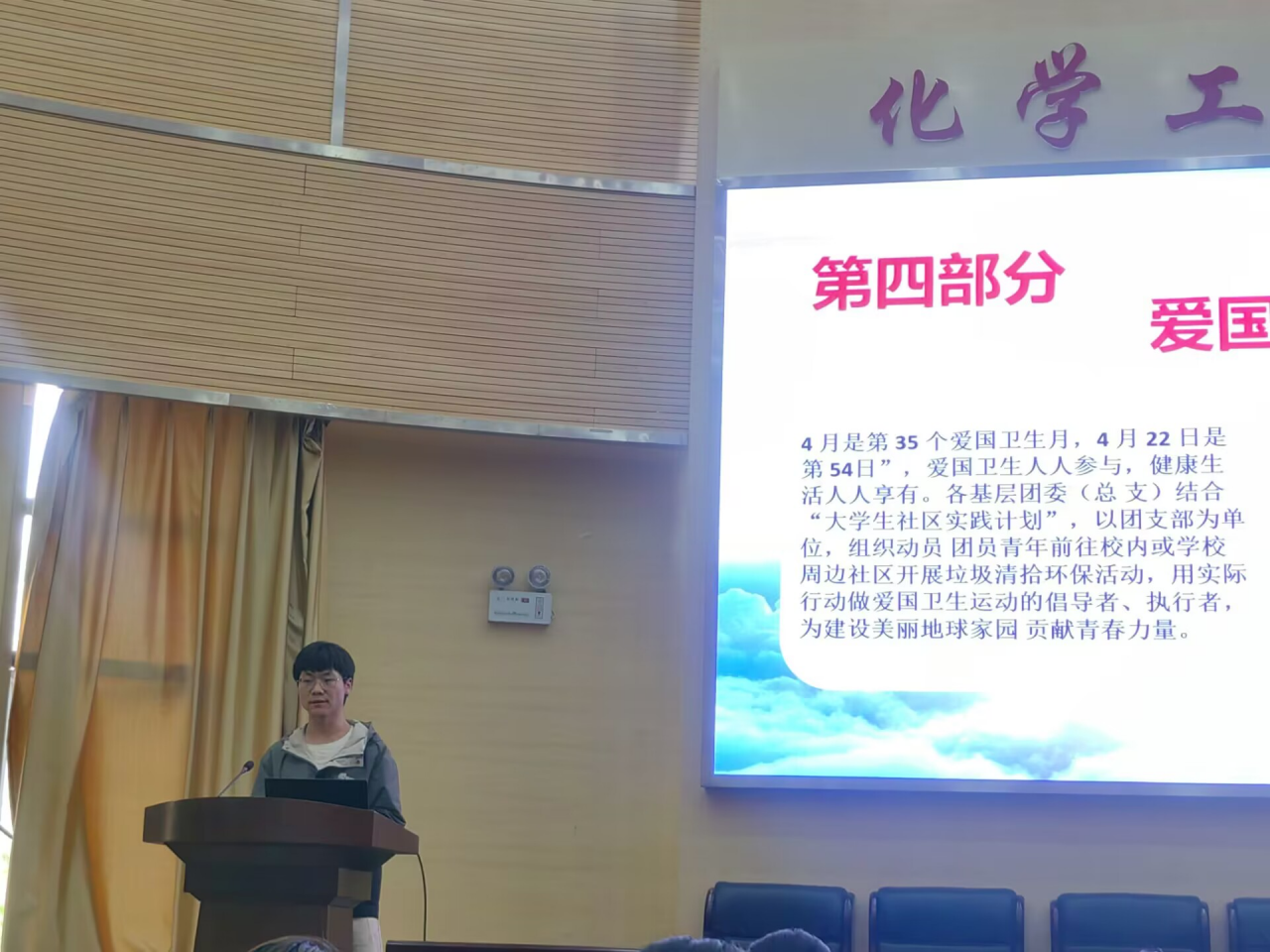 2023年4月27日14:30,独播库 于化工楼100报告厅开展了四月主题团日活动评比,独播库 团委书记李凯宇老师、学院团委指导老师赵振涛出席了本次活动,本次活动由学院团委组织部汤明存同学主持,本科生各班级团支书、团委组织部成员参与了此次活动。