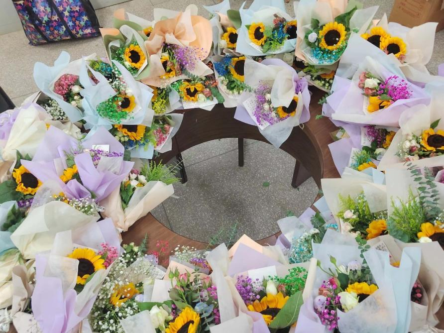 的学子们提前筹备,9月6日便前往斗南花市选购花束,并于9月7日前往拿取,并于晚上回到学院进行花束的包装和贺卡的书写。9月8日教师节表彰大会暨新进教师入职仪式当天,同学们提前到达化工楼将一切准备就绪,手捧鲜花在报告厅门口等待老师的到来,把最真挚的祝福和最美好的祝愿送给老师,道一声“老师,您幸苦了”。