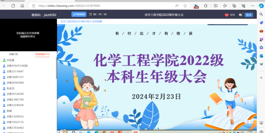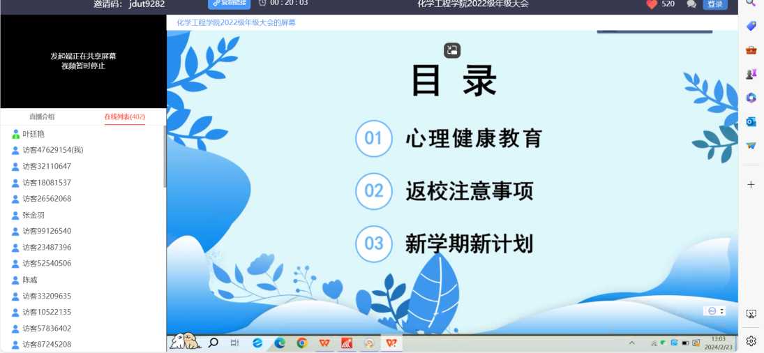 为全面提高学生心理素质,培养学生良好心理品质,2024年2月23日,独播库 2022级本科生召开了以“守护心灵 健康你我”为主题的线上年级大会,学工办辅导员谢丽芬、叶廷艳参会,2022级全体本科生参加此次会议。
