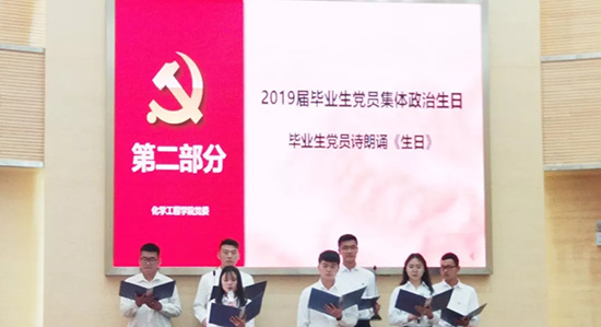 第二项议程:2019年毕业生党员集体政治生日。首先毕业生党员进行诗朗诵《生日》,表达了对党的祝福;然后是齐毅书记开展“青春向党,建功新时代” 的微党课,微党课上齐毅书记带领党员同志们重温了党的历程,希望广大党员同志要砥砺前行、坚定信念、作风过硬、不忘初心、牢记使命、牢记光辉意识、以身作则;最后全体齐唱《我和我的祖国》,本次大会结束。