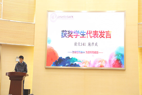 随后是获奖学生代表能化141班的施彦成发言,一开始他向学院的老师表示真挚的感谢,之后他回顾自己三年多的大学生活,结合自己加入排球队和创新团队的经历,讲述了自己的收获以及成长历程,鼓励大家梦在前方,路在脚下。永远不服输,坚定自己的信念,为理想而奋斗,为目标而疯狂。