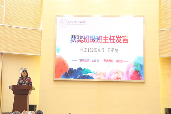 接下来是获奖班级化工152班班主任王平艳老师发言,她说到老师们采取的是“放羊吃草”式教育,作为班主任,他们是牧羊人,一直在引导与激励大家在实践中变得更加优秀。而同时她也希望同学们能做到“无问西东”式成长,不要在虚拟的世界中实现“王者梦”,而应该在生活中成为自己的王者。