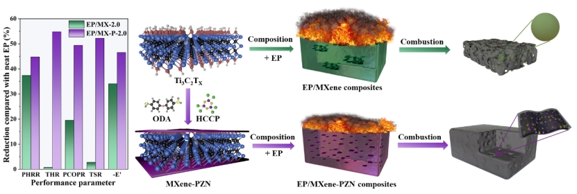 磷化工团队在MXene基协同阻燃体系的设计和机理研究中取得新进展。通过磷腈(PZN)在MXene(Ti3C2TX)表面的原位聚合反应,成功制备了磷氮改性的MXene基高效协同阻燃体系(MXene-PZN);并以MXene-PZN为阻燃功能填料,实现了对环氧树脂(EP)基材热稳定性、机械性能、阻燃性能的全面提升。结合热重、热重-红外联用、SEM、XPS等分析测试方法,重点研究了EP/MXene-PZN复合材料在燃烧的不同阶段所进行的反应和相关的产物结构分析,明确了MXene-PZN在聚合物基材燃烧过程中发挥的协效阻燃机制,包括PZN对Ti3C2TX片层结构的保护机制、Ti3C2TX与PZN的协同催化成炭机制等。该研究进一步明确了磷系改性MXene体系的协同阻燃机制,从而能够为MXene基高效阻燃体系的设计,尤其是磷氮改性MXene基阻燃体系的设计提供更好的理论指导。