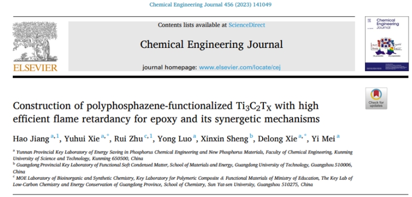 该研究成果以“Construction of Polyphosphazene-Functionalized Ti3C2TXwith High Efficient Flame Retardancy for Epoxy and its Synergetic Mechanisms”为题发表在化工TOP期刊《Chemical Engineering Journal》上。此研究工作得到了国家自然科学基金、云南省基础研究计划基金以及云南省高层次人才支持计划等的资助。