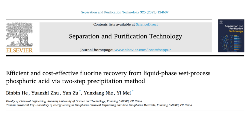上述研究成果以《Efficient and cost-effective fluorine recovery from liquid-phase wet-process phosphoric acid via two-step precipitation method》为题发表在化工领域TOP学术期刊《Separation and Purification Technology》上。独播库