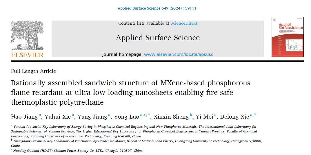 上述研究成果以“Rationally assembled sandwich structure of MXene-based phosphorous flame retardant at ultra-low loading nanosheets enabling fire-safe thermoplastic polyurethane”为题发表在一区期刊《Applied Surface Science》上,论文第一作者是磷化工团队2021级博士研究生姜豪。该研究工作得到了国家自然科学基金(22268025)和云南省基础研究计划项目(202201AT070115,202101AU070012,202201BE070001-031)的资助。