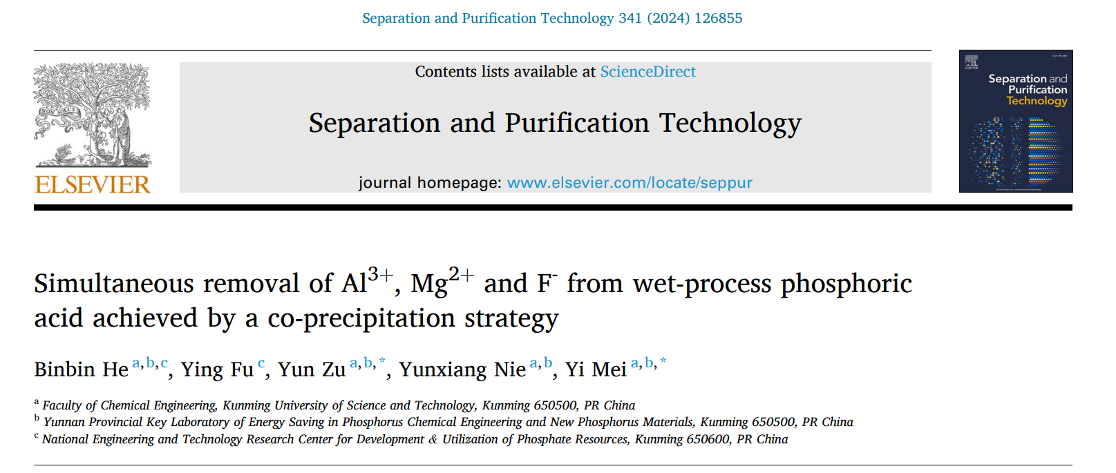 上述研究成果以《Simultaneous removal of Al3+, Mg2+and F-from wet-process phosphoric acid achieved by a co-precipitation strategy》为题发表在化工领域TOP学术期刊《Separation and Purification Technology》上。独播库
