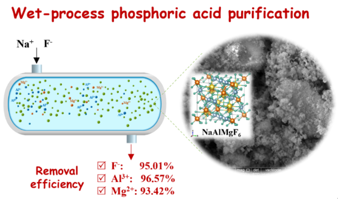 磷化工团队开发了共沉淀技术用于实现湿法磷酸中氟回收和金属杂质的同时去除。通过设计金属阳离子(Na+,Mg2+和Al3+)与F-在水溶液和磷酸体系中不同摩尔比的组合,以探索共沉淀规律。研究结果表明,在纯体系中,当n(Na+): n(Al3+): n(Mg2+): n(F-) = 5: 1.5: 1: 6时,Al3+、Mg2+和F-最终以NaAlMgF6和Na3AlF6的形式共沉淀,其去除率可达90%以上。DFT计算联合XRD精修进一步证实了NaMgAlF6沉淀结构最稳定。在此基础上,在工业WPA中额外加入Na+和F-,使Na+、Al3+、Mg2+和F-以NaAlMgF6的形式共沉淀,在最佳条件下,最终去除率可达90%以上。此外,还实现了Na+和F-的低成本循环回收。这些发现对磷矿及其他矿石中氟资源的高效利用具有重要的经济和环境意义。